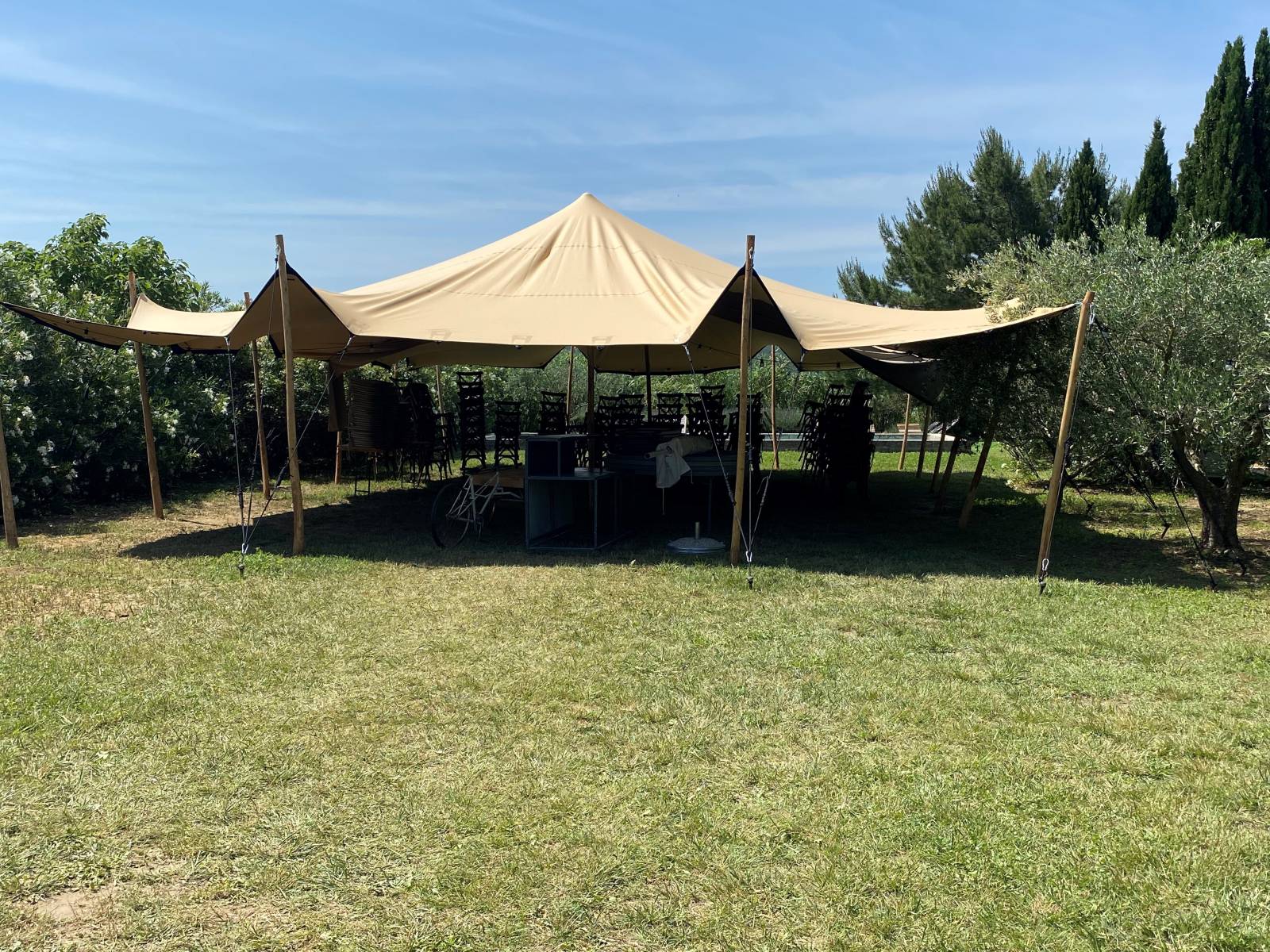 Pour vos plus beaux évènements, Loca Vaisselle vous propose La tente Stretch, aussi appelée tente nomade ou tente berbère, c'est un produit esthétique et flexible d'inspiration nomade qui s'adapte à tout type d'environnement. Il s'agit d'une toile Stretch tendue sur des mâts en bois d'eucalyptus. Cette tente ouverte sur l'extérieur est idéale pour donner une ambiance élégante et cosy à vos événements. Il est possible de combiner deux modules pour ainsi proposé une surface de 15*10 ou de 21*7.5m. N'hésitez pas à nous consulter